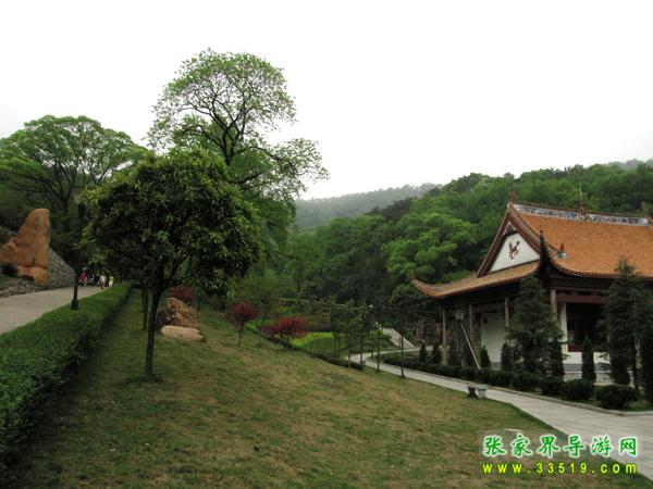 轉(zhuǎn)到祠堂后邊,有一短坡,草色蒼綠,雜有香楓,高不及數(shù)尺。右有一潭,約五尺圓盤,潭水清澈,右岸樟樹兩棵,挺撥林立,樹旁瀑布寬約兩尺,高約兩人,水沫飛濺,水擊聲轟轟,如約大壩泄洪。潭之左邊,有一石梯,拾級而上,就見岳麓山上煙雨蒙蒙,那濃濃的霧水,就像一個打扮得漂漂亮亮的姑娘披上潔白的婚紗——更加?jì)趁膭尤恕?