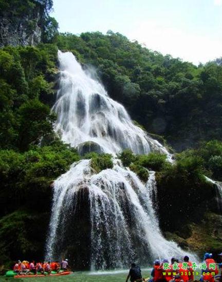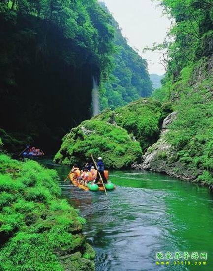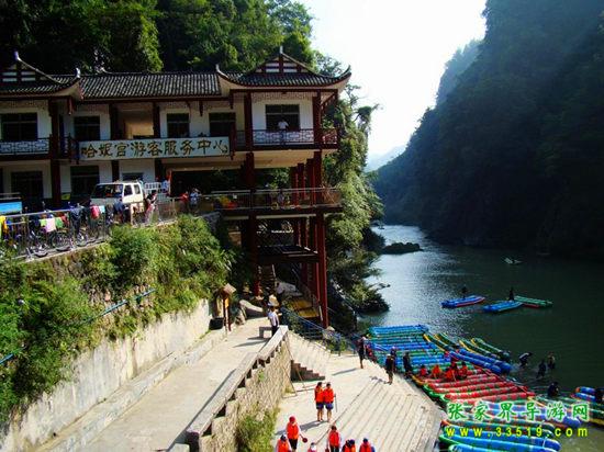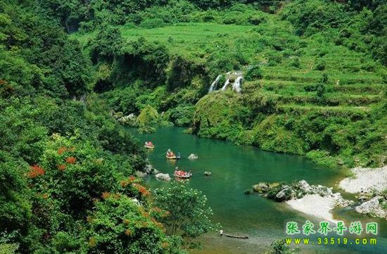 天下第一漂,起點哈妮宮距王村約40公里,行車1小時,終點牛路河距王村30分鐘的車程,漂流水路長17公里,漂流兩個半小時。從哈妮宮放舟而下,一路是古老的河道,絕壁百里,怪石嶙峋,灘奇水異,兩岸蒼翠的林木,云霧繚繞,飛瀑流泉與溶巖峰林交相輝映。拐一百五十五個彎,在一百三十三個灘潭中穿梭而行,迂回流連,馳魂奔魄,心曠神怡。