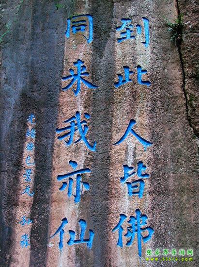 不二門內(nèi)由石灰?guī)r風化形成的一尊巨大石佛,聳立于萬綠叢中,高六丈,青冠白面,頭頂白云,腳踏碧水,人們以其形神稱為“觀音巖”?!队理樋h志》稱“觀音巖素有‘湘景名峰第一巖’之稱”。觀音巖下,聳立著一組瑰麗多姿、古色古香的殿閣建筑群,這就是“嵩山堂”,包括三觀殿、玉皇閣和禪房客舍,工藝精巧,玲瓏別致。特別是正殿后的地藏庵,與老司城明代建筑祖師殿結構相似,背倚石壁,右通八陣圖,左達熱水坑,周圍怪石森列,古木參天。觀音巖北部山上是天造地設的“八陣圖”,有的如排戟,有的似春筍;有的像古佛,有的若走獸。八陣圖之奇,不僅在于它林立的怪石,最主要的是在于由龜裂紋石板鋪成的時上時下時隱時現(xiàn)的彎彎小徑——或穿過地下幽深的石洞,或延展于密林雜草叢中,或環(huán)繞于奇峰怪石之間,使八陣圖的東、南、西、北四門相通,復雜繁多的石徑互相連接形成網(wǎng)絡,人們有時難以找到出路。也許,這就是八陣圖命名的緣由。不二門內(nèi)兩側石壁開闊如屏,歷代文人墨客或贊山水之幽絕,或抒心胸之豪情,雕鑿了種種摩崖石刻。據(jù)《永順縣志》記載,不二門石刻有神秀獨鐘、吾道南來、白云門開、砥柱中流、眼前南海、百寶勝光、別開生面、別有天地等100多處。歷經(jīng)風雨滄桑之后,現(xiàn)僅存鬼斧神工、勝境無雙、滌盡塵氛、瞻奇仰異、海上飛來等數(shù)十處。清代名士白介庵所作《松徑留云》、《古洞仙蹤》、《層閣聳翠》、《玉嶂屏環(huán)》、《澄潭月影》等觀音巖八景詩尚凸現(xiàn)在石壁之上。其中《石門天鑿》一詩完整無缺:“法門高聳五云偎,鬼斧神工妙化裁。鞭石無痕還著相,振山有鐸不須錘。地沾花雨千歧坦,道接薪傳一線開。莫道終南稱捷徑,巨靈神辟小蓬萊。”清代庚辰年間的探花景元,曾在石壁上題刻“到此人皆佛,同來我亦仙”。他還以一筆揮成的“山青海岸”疊字如圖似的符合成一個“岸”字鑿刻在摩崖之上,堪稱罕世之作。石壁上近年來還鐫刻了偉人毛澤東的詩詞和儒將蕭克、畫家黃永玉等巨擘的題字,游人置身其間,飽享山水美景、名勝古跡與文化藝術的熏陶。