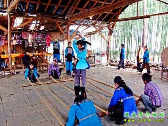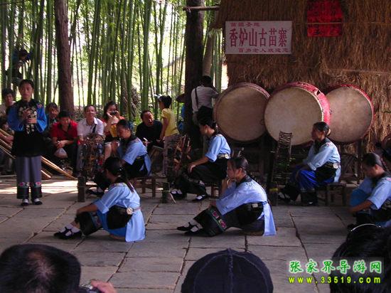 進(jìn)入鳳凰香爐山苗寨必須過三道關(guān):一是去剿匪,二是對山歌,三是喝三碗米酒。如果過不了這三道關(guān),是不能進(jìn)寨子的。剿匪就是過一道山洞(當(dāng)年土匪躲藏的地方),也就是拍攝電影《湘西剿匪記》的現(xiàn)場,洞內(nèi)驚險(xiǎn)崎嶇,道路難走,還要過一條河,河面上的橋是用小木板釘成,僅一米寬,上面滴水,橋上很滑,橋下流水很急。
