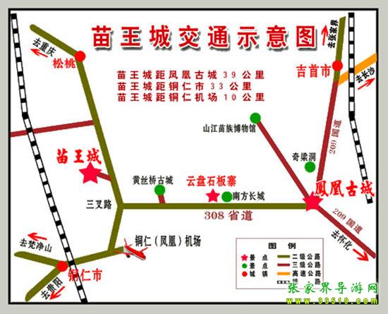 苗王城位于貴州省松桃苗族治自縣正大鄉(xiāng)境內(nèi),距銅仁鳳凰機場9公里,距全區(qū)首府銅仁市的火車站32公里,距鳳凰古城39公里,境內(nèi)有迓大二級公路,以及正在修建的杭州---云南瑞麗的高速公路,松桃境內(nèi)段,交通十分方便。