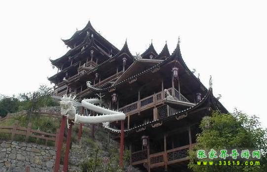 望郎峰北隔幽谷西望,一巨大石壁高聳云端,面寬達(dá)百米。因受風(fēng)雨剝蝕,流痕結(jié)網(wǎng),與頂端參差不齊的峰石結(jié)合,構(gòu)成錯(cuò)落有致的一幅壁畫(huà):林木掩映的圍墻之內(nèi),池塘水榭,墻垣瓦梁,依稀可見(jiàn)。還有幾座吊腳樓,幾座寺廟,其間仿佛有人來(lái)往。雨天,云霧飄拂,樓臺(tái)墻垣若隱若現(xiàn),儼然海市蜃樓。