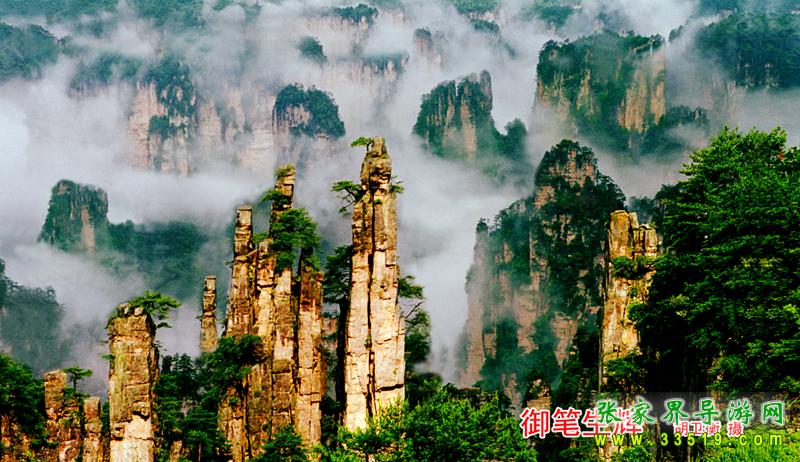 眼前這幾支細(xì)細(xì)瘦瘦的山峰,好像一支一支、一節(jié)一節(jié)地從這個峽谷中長出來的一樣,形狀很像一排倒插在筆筒中的毛筆。筆尖、筆桿可以分得清清楚楚,尤其是頂部一些不大不小的松樹,剛好像是毛筆的筆毫!這簡直就是出自能工巧匠之手!山長成這樣子多么不容易啊,它經(jīng)過億萬年流水切割、風(fēng)雨侵蝕、重力崩塌等多種復(fù)雜的地質(zhì)作用才最終形成。除了大自然,誰有這樣的匠心和耐心,對堅(jiān)硬如鐵的石英紗巖進(jìn)行這樣的精雕細(xì)刻?有人說,張家界如詩如畫的風(fēng)景,就是這幾支筆以青山綠水為線條,以風(fēng)花雪月為色彩,以時間空間為畫紙畫出來的。