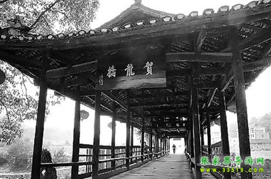 賀龍橋原稱“永安橋”。飛架于賀龍故居右側(cè)玉泉河上,是一座石墩、木粱、騎廊的風花橋。東西長40米、寬7米、高8米。龍爪翹檐,中聳堡亭,8尊石獅,分置橋頭及石墩之上,造型渾厚古樸,富有民族特色。此橋原是溝通桑植內(nèi)外半縣的必經(jīng)之道,是上川鄂下津澧的要津,也是當年鹽局奪槍、桑植起義的發(fā)端處。系賀龍曾祖父賀廷宰首倡捐資修建,幾番修而復圮。至1916年,終由賀龍父親賀仕道襄修告竣。1929年冬,桑植“剿共”司令陳策勛,謂以破“賀氏風水”,令毀此橋。解放后,桑植縣人民政府于1952年冬按原樣復修,命名“賀龍橋”。“文化大革命”動亂中,林彪、“四人幫”誣陷賀龍,指使“紅衛(wèi)兵”毀橋,群眾奮起護衛(wèi),才幸免劫難。1983年5月,賀帥女兒賀曉明應縣政府請求,得全國書法家協(xié)會秘書長謝德萍書匾“賀龍橋”,高懸橋之東西首,永志紀念。1978年,賀龍故居及其生平業(yè)績陳列室、賀龍橋,列為省級重點文物保護單位。凡到賀龍故居、賀龍紀念館的游客這是必經(jīng)之地。