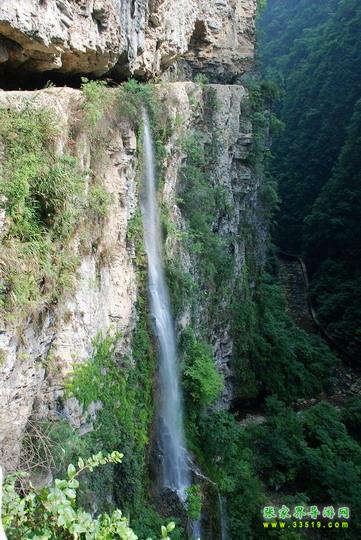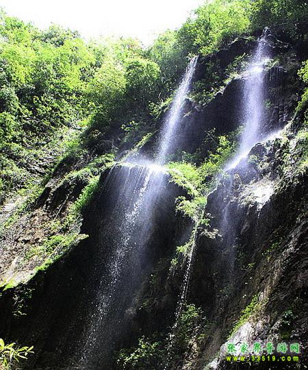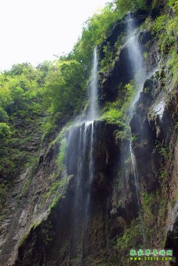 【珍珠墻】過了神泉橋,請大家留步,做一個(gè)短暫的停留。請大家看,我們的面前,石壁之上,生長著很多植物,很多草類,山上的泉水沿著石壁,以均勻的流量漫流下來,在這些草葉上、枝枝蔓蔓上形成了一個(gè)個(gè)潔白晶瑩的水珠,大家看像不像珍珠?游客朋友們都將這堵石壁叫做珍珠墻,掛滿珍珠的石墻啊。