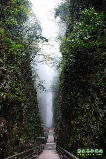 【天梯棧道】我們現(xiàn)在所步行的這段游道坡度很大,棧道的木板很窄,依次往下延伸,就像一架天梯,把我們送往迷人的仙境。我們叫它天梯棧道。各位來賓,梯陡人多,大家一定要慢一點(diǎn)啊,一定要注意安全?。?br />