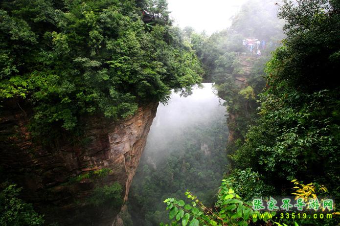 醉月臺(tái)西去兩百余米,有一座50多米長(zhǎng),15米厚的條石搭在兩座山峰之間,其下嵌空350多米,這就是名聲赫赫的天下第一橋。橋約20米長(zhǎng),最薄處約4米厚,最窄處只有2米多寬。與兩邊橋墩合為一體,天衣無(wú)縫。橋面兩側(cè)、橋頭兩壁上端均有綠樹(shù)簇?fù)?,郁郁蔥蔥,而橋下洞壁宛若刀削,草木不生。望橋臺(tái)有三處,其一在橋邊20米處,俯視橋面,但見(jiàn)兩側(cè)綠叢中間,一段平路通向彼峰,橋洞依稀,下端被密林遮住,往來(lái)其間,無(wú)甚驚險(xiǎn)。其二在橋左側(cè)30多米處的石壁上,透過(guò)樹(shù)枝向右下俯視,可見(jiàn)橋洞側(cè)面一部分,不知其下幽深幾許,若逢雨后初晴,有云霧在眼前突涌,亦不明其由來(lái)。最扣人心弦的是繞過(guò)右邊長(zhǎng)達(dá)1200多米的“U”形深谷,隔200余米的澗谷向東觀賞,橋面橋洞,橋壁橋底,一覽無(wú)余。它造型巍峨,偉岸雄奇,高峻深險(xiǎn),形神逼真,確屬大自然神工鬼斧之杰作。