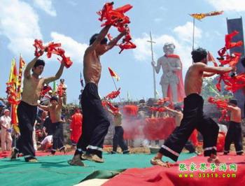 搖鈴隊伍圍圓圈有節(jié)拍的搖鈴。圓圈中另兩人面對面用肩共杠一根齊眉棍(木桿),左手叉腰,右手扶棍。從棍上搭一疋絲帕,一氣功師進來拿絲帕一頭,另一壯漢拿線帕另一頭。氣功師手拿絲帕慢慢下蹲,壯漢牢牢握緊絲帕。待氣功師翻天睡在地上后,其他人搬一床棉被蓋其肚部,再在上面放一塊木板,木板上放一副大石磨,石磨上架一套鐵犁、粑。氣功師睡在地上用右手打竹掛,口喊:"打個陰陽一只"!把竹掛打在地上,掛未成陰陽一只時,還要繼續(xù)打,直到打成,才把放在氣功師肚部的所有東西取下,氣功師雙手握緊絲帕慢慢起身站立。表演結束。