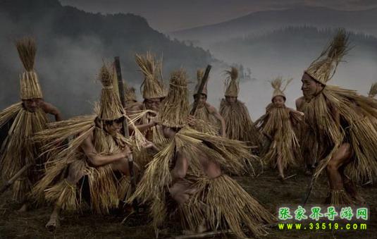 茅古斯雖然還不是成熟的戲劇形式,但已有模擬遠古先民勞動和生活的故事情節(jié),并通過舞蹈、道白來表達內(nèi)容。通常由15人表演。表演者頭戴尖頂齊脖茅草帽,頭扎草辮,全身皆用稻草包扎,象征全身都長著毛的先民。演出時,有簡單布景,由一人領(lǐng)舞出場,茅古斯數(shù)人尾隨歡跳,抖動全身稻草,搖晃頭上草辮,以變嗓對話歌唱。表演內(nèi)容有刀耕火種、圍獵、捕魚、接新娘、先生教書、甩火把等。茅古斯表演從形式到內(nèi)容,都別具一格。演出自始至終講土話、唱土歌,但以對白為主體,觀眾也可答話插白。演員或歌或舞,或蹦蹦跳跳、翻跟斗、做游戲?;蛩椴竭M退,曲膝抖身,左跳右擺,搖頭聳肩,全都是模仿古人粗獷的憨態(tài)。形態(tài)滑稽,詼諧有趣。