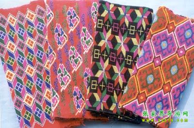 織錦。又名“西蘭卡普”、“土花鋪蓋”,為土家族傳統(tǒng)工藝品之一,是森林公園工藝品廠(chǎng)的主要產(chǎn)品。織錦是在特制的本質(zhì)織機(jī)上以錦紗為經(jīng)、五彩絲線(xiàn)為緯、手工提花織成。以其質(zhì)地厚實(shí)、堅(jiān)韌,色彩鮮艷,格調(diào)古樸,流暢生動(dòng)著稱(chēng)。圖案有花草、鳥(niǎo)獸、生產(chǎn)、生活、幾何、字樣等種類(lèi)。為舊時(shí)土家姑娘必備嫁妝之一。據(jù)考證,早在漢代,土家織錦就作為方物貢入漢室宮廷。20世紀(jì)后,土家織錦曾漂洋過(guò)海至日、美、英等國(guó)展出,并作為禮品,被國(guó)家領(lǐng)導(dǎo)人贈(zèng)送給外國(guó)元首及政府官員,如今織錦以壁掛、枕巾、沙發(fā)墊、桌圍、提袋、服飾等多種式樣遠(yuǎn)銷(xiāo)世界各地。