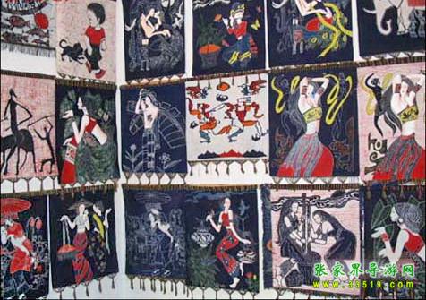 刺繡。是土家姑娘在直紋平布上,按照布紋的經(jīng)緯和預(yù)先繪畫(huà)的花樣與底色不同的絲線(xiàn)繡成圖案。舊時(shí)姑娘們穿的繡花衣服,繡有服飾花邊、胸花、帽花,此外繡花枕頭、繡花荷包等也是精巧的手工工藝品。土家刺繡在配色上有自己的講究與習(xí)慣,一般選用青、藍(lán)、大紅等深色布料作底布,用淺色繡線(xiàn)制作圖案,或者相反,兩種用法的結(jié)果使繡品顯得質(zhì)樸逼真,色澤鮮艷,對(duì)比強(qiáng)烈。傳統(tǒng)圖案有“花開(kāi)富貴”、“龍鳳呈祥”、“鴛鴦戲水”、“喜鵲鬧梅”、“松鶴同壽”等,分室內(nèi)、衣著、工具、行李裝飾等多種種類(lèi)。在景區(qū),土家婦女邊繡邊賣(mài)的精美鞋墊,深受海內(nèi)外游客喜愛(ài)。
