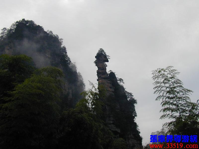 (南天一柱)現(xiàn)在我們前方幽谷峰林中有一高達(dá)200多米的孤峰,宛如擎天玉柱。上部灌木點綴,中部巖身赤裸,下部樹木遮掩,峰體渾圓、偉岸,因立南天門下而得名?!?/p>