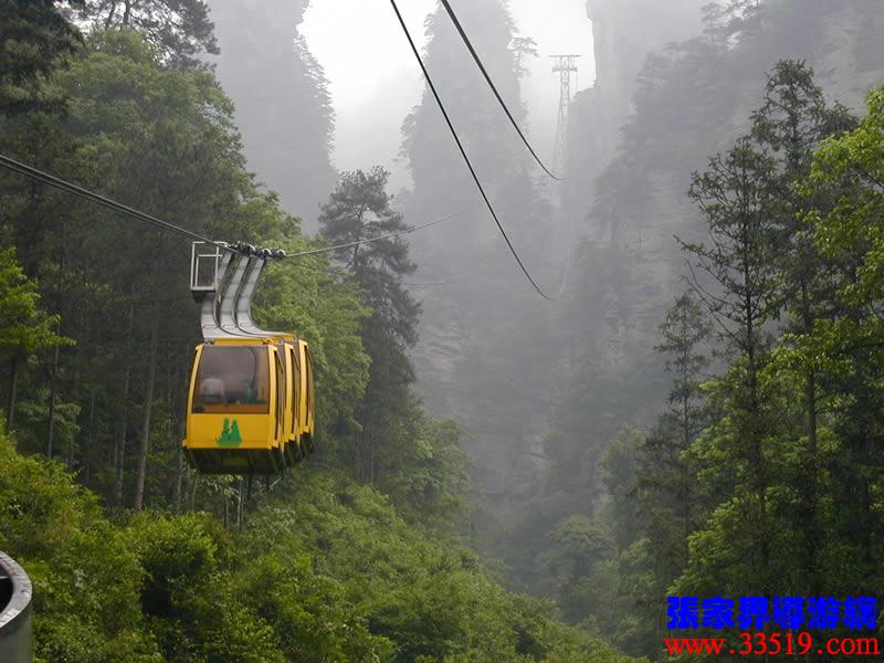 (索道站)現(xiàn)在,我們就要乘索道下山了。黃石寨(黃獅寨)索道是1995年5月至1997年9月臺灣證吉興業(yè)有限公司與張家界公園管理處合資興建的我市第一條觀光索道。索道線路水平距863,高差431米,運行速度每秒8米,單向小時運量948人,設(shè)備全部從法國波馬公司引進(jìn),總投資4000多萬人民幣。黃石寨(黃獅寨)索道的建成,為公園開辟了一條空中游覽線,填補了張家界無觀光索道的空白。古詩說:會當(dāng)凌絕頂,一覽眾山小。乘索道觀張家界公園,別是一番感受。
