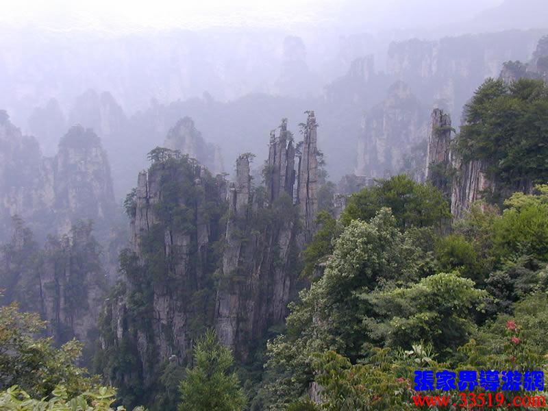 (大觀臺)這就是大觀臺。極目遠眺,千百座奇峰盡收眼底。一位詩人說,武陵源的砂巖峰林是一步一觀景,千步千造型,一山有四季,十步不同天。專家測算出武陵源石峰有3103座。一如一位高超的雕塑大師,模擬宇宙萬物,無不形狀逼真,維妙維肖,栩栩如生,呼之欲動。有的如海螺出水,有的如金龜銜日,有的如蓮花盛開,有的如天橋橫空,有的如長槍刺天,有的如寶塔聳立,有的如老人采藥,有的如玉女梳妝,有的如將軍出征,有的如戰(zhàn)馬長嘯,有的如情人幽會,有的如夫妻相擁,有的如仙女散花,有的如村姑守望有的孤峰獨秀,有的直插云霄,有的婷婷玉立,有的威武勇猛,有的小巧玲瓏,有的大氣磅礴。進入武陵源,但見一片峰的森林,峰的世界,峰的海洋。挺拔、奇秀、集中、原始、粗獷、古野。這就是武陵源。一位藝術大師說:武陵源的山峰,改寫了山的概念。大攝影家陳勃說:“三山五岳堪比美,華夏風光每一流。”王繼杰先生說:“武陵源上三日游,勝讀千篇李杜詩。”許世杰先生說:“秀幽險峻稱奇絕,五岳黃山拜下風。”李成瑞先生為此大抱不平:“神州勝景誰為最?須請霞公重評勘。”可惜徐霞客無緣到大觀臺來,也不可能為武陵源作甚評價了。