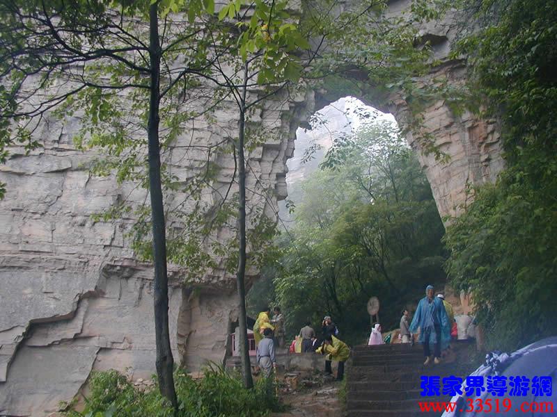 (南天門)大自然的造化真奇妙,利用一塊巨大的板狀石峰鑿出一扇大門,底寬10余米,高15米。相傳當年屈原登天臺問天,就是從這里經過的,故民間叫它“通天門”。據(jù)說向王天子在水繞四門苦練三年零六個月武藝,起事那天,就是立在這兒向皇宮連射三箭,流傳在武陵源民間的“三箭射皇宮”的典故就從此來。