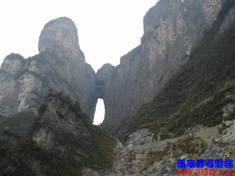 (俯視天門)站在這里可以俯視面向北面的天門洞,以及天門山公司正在修建的通天大道。1999年11月世飛賽期間,中央電視臺6號機組正是在這里拍攝飛機穿越天門驚人場面的。這兒距天門洞垂直高度200多米。