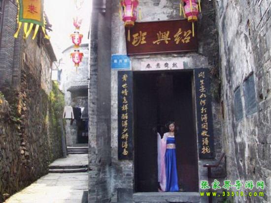 紹興班,位于余家沖,系清代青樓。 始建于清咸豐末年(1860年),是一座四周用封火墻圍護(hù)的木質(zhì)穿斗式的結(jié)構(gòu)建筑,單檐重層,兩進(jìn)三層,各層樓道封閉,分隔有致。各房間置有暗門。具有極其隱蔽的行業(yè)特征。面闊較寬。有濕天井和干天井兩個(gè)。通風(fēng)采光效果較佳。木窗均有雕花,且式樣各異。地面分別用青石板和杉木板鋪就,房間屋面均用洪油漆刷,整體形態(tài)完好。近作局部保護(hù)性維修;增添了相關(guān)實(shí)物布置和表演節(jié)目,對(duì)游客開放。