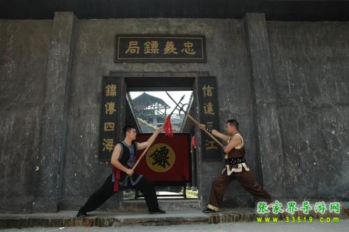 忠義鏢局,它始建于清乾隆四十二年(1777),位于洪江龍船沖,這里會館、錢莊、豪宅林立,堪稱洪江的曼哈頓。與我們在古商城看到的窨子屋不同,這是一座典型的北方四合院,前庭后院,布局嚴謹,軸線明確,左右對稱,主次分明。前院是鏢師練功習武之地,墻壁上書有“忠”、“孝”、“禮”、“義”四字和“十八羅漢練功圖”;后院為鏢師起居和洽談生意之所,內供奉關武大帝。忠義鏢局主要為豪商巨賈押運銀票、貨物,看家護院,坐夜守店,也開館收徒,傳授武藝。忠義鏢局的掌門人劉大鵬,湖南長沙人,幼時即入嵩山少林寺習武,不僅精通十八般武藝,而且頭腦精明,他把鏢局開在這洪江最繁華的金融一條街,足見他的經商意識和人面廣了。現(xiàn)在忠義鏢局現(xiàn)場表演古代押鏢、行鏢全過程,是人們了解中國古代鏢行歷史文化的活性博物館。有興趣的朋友可以去洪江古商城親自感受一下當時押鏢的情景吧。