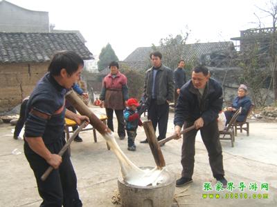 土家人民素有“二十八,打粑粑”的說法。每逢春節(jié)來臨,農(nóng)歷臘月末,家家都要打糯米糍粑,所謂打糯米糍粑,據(jù)當(dāng)?shù)剜l(xiāng)土志書記載:“系糯米飯就石槽中杵如泥,壓成團(tuán)形,形如滿月。大者直徑約尺5,尋常者約4寸許,3至8分厚不等。”打糯米糍粑是一項(xiàng)勞動強(qiáng)度較大的體力活,一般都是后生男子漢打,兩個人對站,先揉后打,即使冰雪天也要出一身汗。做粑粑也很講究,手粘蜂臘或茶油,先出砣,后用手或木板壓,要做得玉圓光滑,講究美觀。