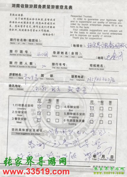 2009年6月17日楊女士一行7人接待質(zhì)量反饋單: