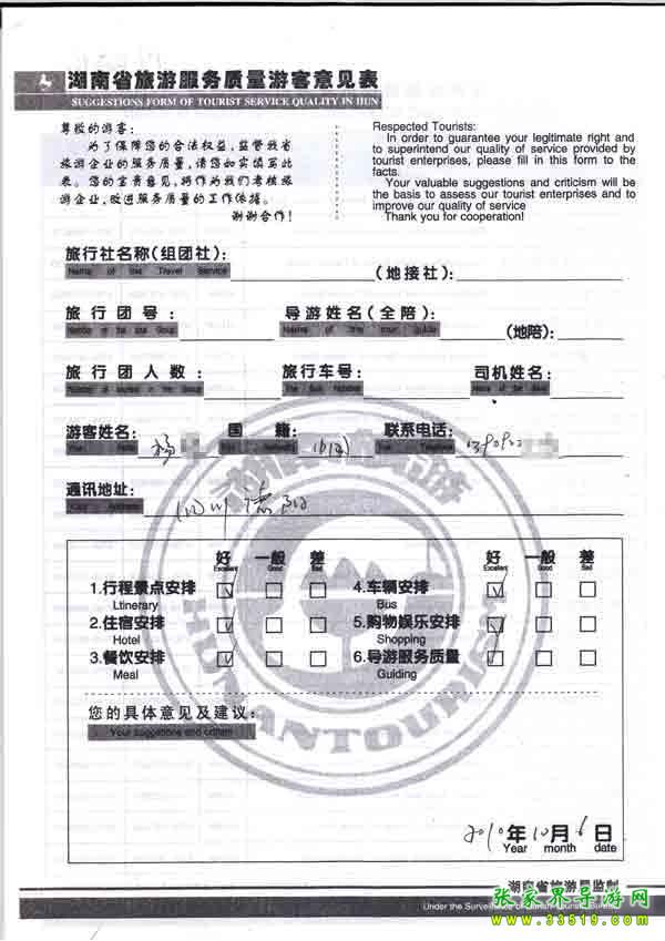 2010年10月6日四川楊先生一行2位旅游質(zhì)量反饋