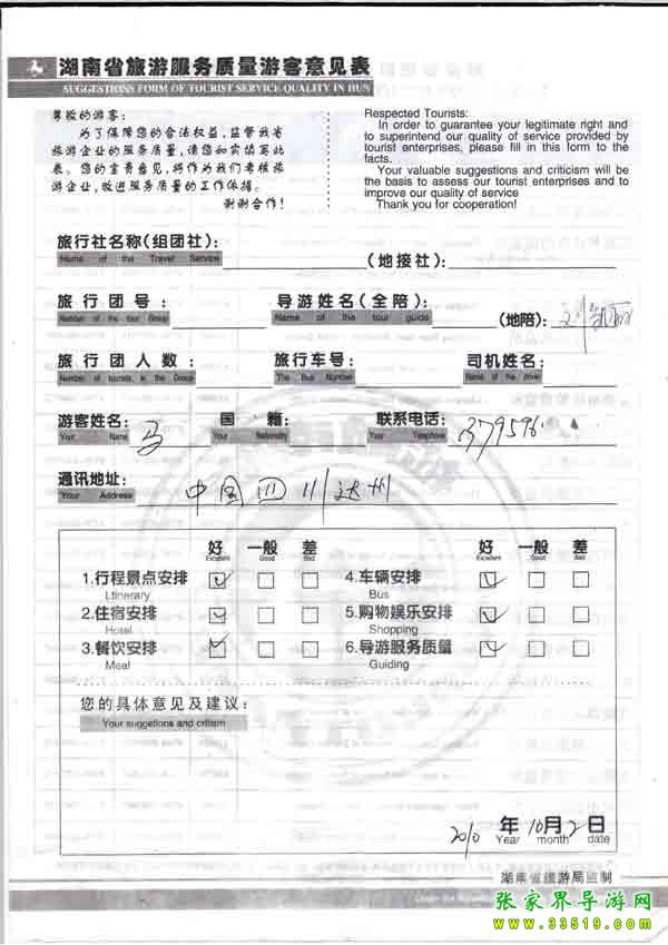 2010年10月2日四川馬先生一行17位旅游質(zhì)量反饋